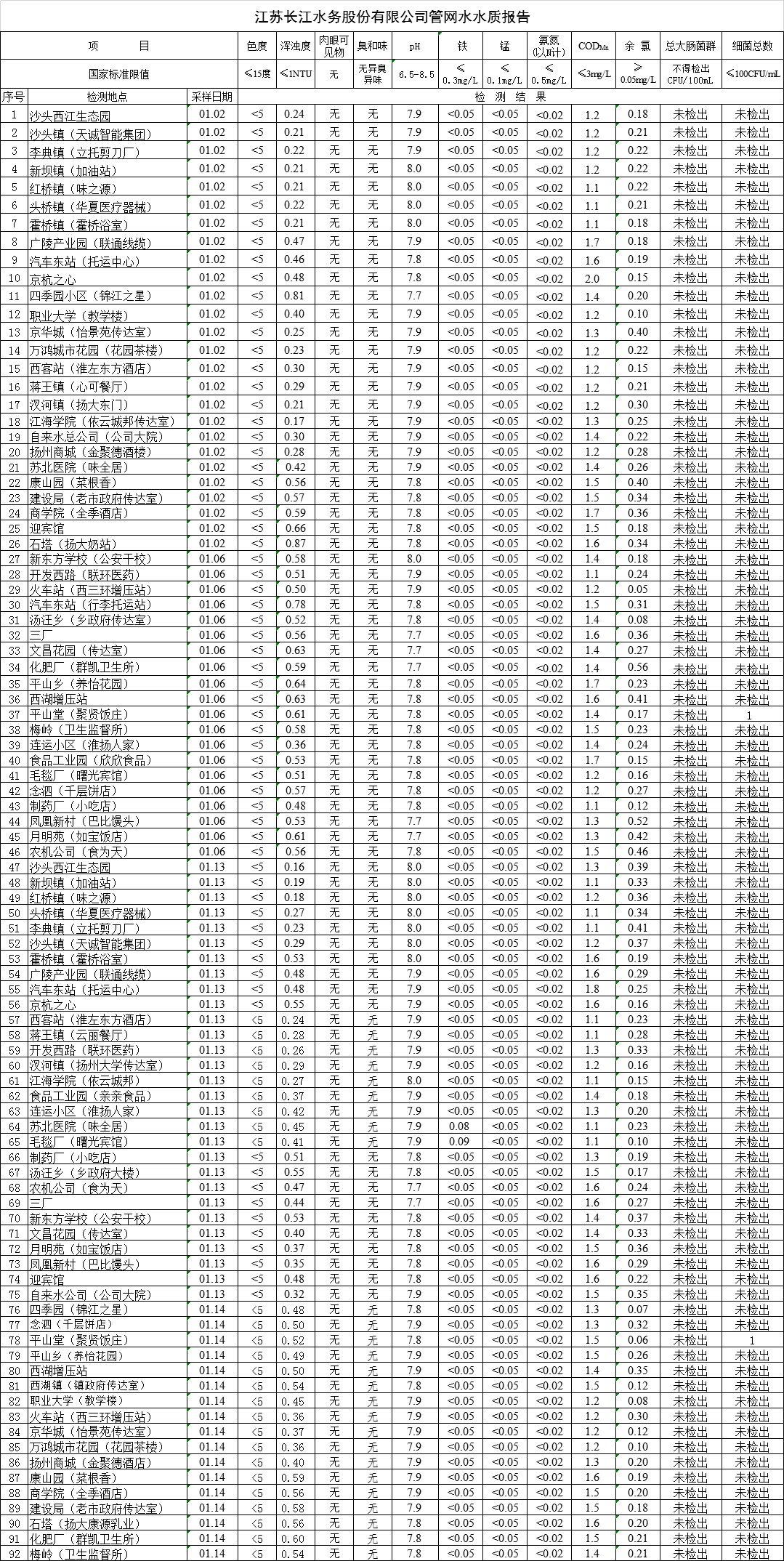 江蘇長江水務(wù)股份有限公司管網(wǎng)水水質(zhì)報告(2020年1月)
