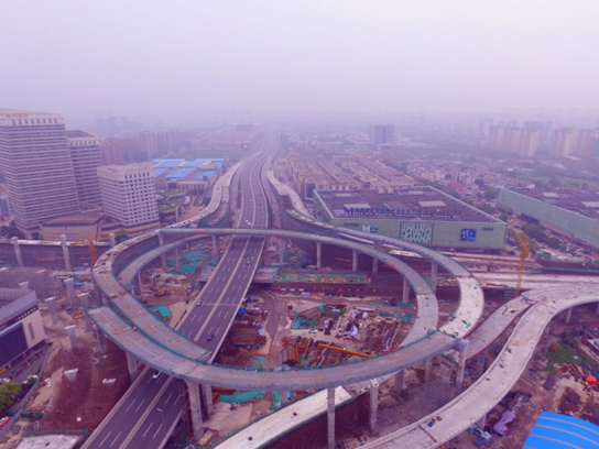 潤揚(yáng)路快速化改造工程(潤揚(yáng)路-江陽路互通立交)鋼箱梁共計(jì)9聯(lián),包括主線1聯(lián),匝道8聯(lián),全長904米,重達(dá)5464噸。其中主線鋼箱梁下穿揚(yáng)州南部快速通道,8聯(lián)匝道鋼箱梁高低跌錯,與現(xiàn)澆箱梁完美結(jié)合,形成渦輪型互通立交。全橋鋼箱梁分為65個節(jié)段進(jìn)行吊裝,本次吊裝的最后一段鋼箱梁長16.7米、寬3.31米、高0.84米、重20噸。