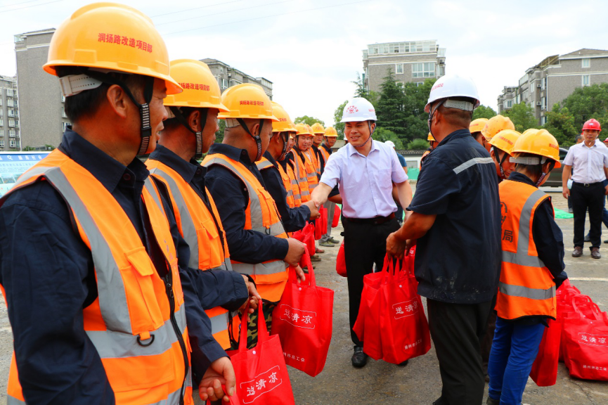 8月7日上午,揚州市總工會副主席韓士軍一行來到潤揚路快速化改造工程施工現(xiàn)場走訪慰問,為高溫下奮戰(zhàn)在施工一線的建設者們送上了親切的問候。市建設產業(yè)工會主任范華、城控集團黨委副書記徐飛等參加活動。