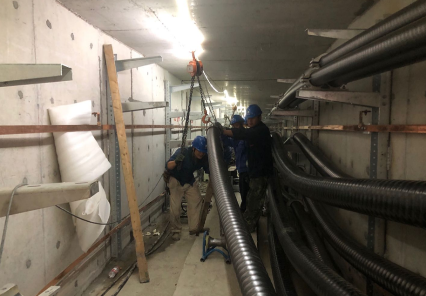為了確保工程安全有序進(jìn)行,電纜敷設(shè)前,電力人員對(duì)每個(gè)井位的地形、地貌都要進(jìn)行仔細(xì)勘察,并對(duì)電纜下井地點(diǎn)進(jìn)行詳細(xì)安排。電纜敷設(shè)期間,每天有80多名工人在現(xiàn)場(chǎng),他們借助機(jī)械,將電纜從沉井滑入電力管廊,再借助機(jī)械輸送到安裝地點(diǎn)。電纜敷設(shè)時(shí),每隔一定距離串聯(lián)一臺(tái)電纜輸送機(jī),每?jī)膳_(tái)輸送機(jī)之間布置若干電纜滑車。電纜如果需要轉(zhuǎn)向,則會(huì)配備電纜轉(zhuǎn)角滑車。在敷設(shè)過程中,為保證電纜頭始終處于拉直狀態(tài),還設(shè)有專人負(fù)責(zé)電纜頭牽引,并觀察各個(gè)電纜輸送機(jī)和滑車的運(yùn)行情況,以防止敷設(shè)中電纜蹦出而損壞電纜保護(hù)套。
