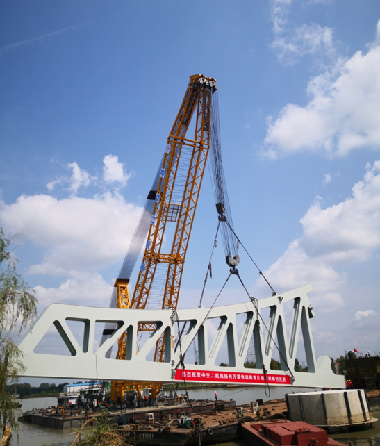 9月26日下午,萬(wàn)福快速路跨京杭運(yùn)河大橋首片鋼桁架吊裝成功,打響了大橋上部結(jié)構(gòu)施工的第一槍。