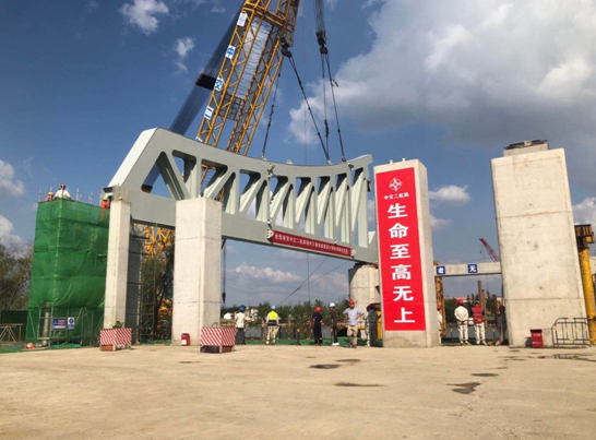 鋼桁架安裝是大橋整個(gè)施工過(guò)程中施工難度最大、技術(shù)要求最高的環(huán)節(jié),項(xiàng)目部從構(gòu)件進(jìn)場(chǎng)、吊裝、精準(zhǔn)定位,每一道工序、環(huán)節(jié)都實(shí)行全過(guò)程、無(wú)縫隙的標(biāo)準(zhǔn)化管理,全力確保安裝和細(xì)節(jié)滿(mǎn)足技術(shù)要求。為確保首節(jié)鋼桁架吊裝工作有序開(kāi)展,項(xiàng)目部成立了專(zhuān)項(xiàng)施工領(lǐng)導(dǎo)小組,多次組織召開(kāi)籌備會(huì)并進(jìn)行吊裝試驗(yàn)。由于吊裝施工是在繁忙的運(yùn)河Ⅱ級(jí)航道,航道運(yùn)輸船舶眾多,為確保航道安全,項(xiàng)目部多次與地方海事協(xié)調(diào),提前發(fā)布封航通告,吊裝過(guò)程實(shí)施水上臨時(shí)交通管制,為安全順利吊裝提供了堅(jiān)實(shí)保障。