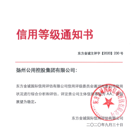 9月30日,經(jīng)東方金誠國際信用評估有限公司評級委員會最終審定,給予揚州公用控股集團有限公司AA主體信用評級,評級展望為穩(wěn)定。