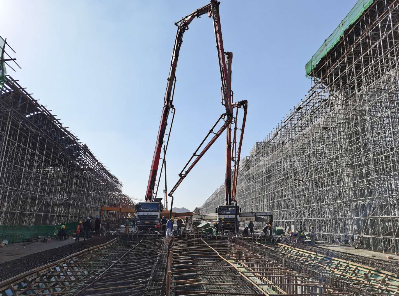為保證項目工期,項目部統(tǒng)籌兼顧,積極謀劃,在保證橋面附屬工程施工的同時,也保證了箱梁施工工作的穩(wěn)步推進。每一次澆筑前,對施工班組進行質(zhì)量安全技術(shù)交底,嚴格過程控制和工序銜接,確保工程質(zhì)量;現(xiàn)場施工嚴格按照專項方案,現(xiàn)場技術(shù)負責人對每道工序進行嚴格審核,牢牢把關(guān),以“高標準,嚴要求”進行每道工序的驗收;項目成立黨員先鋒隊和青年突擊隊,黨員領(lǐng)導干部沖鋒在前,全體參建人員迎難而上,緊盯節(jié)點,細化措施,落實責任,強力推動工程順利進展;同時,現(xiàn)場施工人員積極主動爭取一切有利條件,攻堅克難,搶抓時機,多措并舉,合理配置資源,全力保障每一聯(lián)現(xiàn)澆箱梁的順利澆筑。此次主線現(xiàn)澆箱梁的澆筑完成,為項目全面進入附屬工程施工、完成整體目標任務(wù)奠定了堅實的基礎(chǔ)。截止日前,工程全部66聯(lián)現(xiàn)澆箱梁,已澆筑61聯(lián);支架已全部搭設(shè)完成;附屬工程防撞護欄已完成9800米,完成64.1%;橋面鋪裝已完成48聯(lián),完成64%;正在進行瀝青攤鋪準備工作,各工序施工正穩(wěn)步推進中。