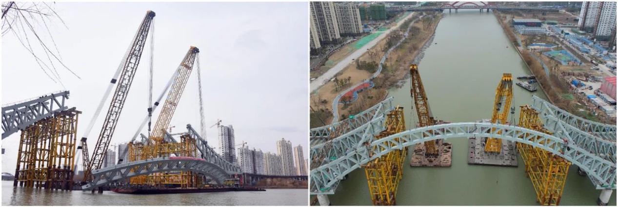 跨京杭運河大橋拱肋部分的合龍段共有三節(jié),其中含兩節(jié)對稱的邊拱中跨合龍段,一節(jié)中拱中跨合龍段。本次吊裝的是跨京杭運河大橋合龍段的首節(jié),長82.2米,高17.4米,重282.4噸。截至目前,項目主體工程已完成65%。