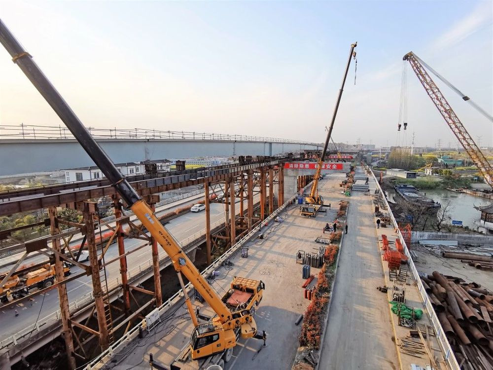 運(yùn)河南北路快速化改造二期工程(萬(wàn)福西路—物港路北)全線(xiàn)采用高架式快速路斷面,總長(zhǎng)2.73公里,標(biāo)段范圍內(nèi)包含運(yùn)河南北路高架、萬(wàn)福路互通樞紐和全線(xiàn)地面道路。高架主線(xiàn)橋上部結(jié)構(gòu)大部分采用現(xiàn)澆預(yù)應(yīng)力混凝土連續(xù)箱梁,在運(yùn)河北路與古運(yùn)河交界處,設(shè)計(jì)在原夫差橋上方進(jìn)行施工架設(shè),平行上跨新建230米左右幅三跨連續(xù)鋼箱梁,雙向10車(chē)道,是揚(yáng)州快速環(huán)路中唯一一座平行上跨新建的“橋上橋”。其中,鋼箱梁施工采用的是搭設(shè)高空施工平臺(tái),將鋼箱梁吊運(yùn)至平臺(tái)上拼裝,然后頂推到位的方法施工。