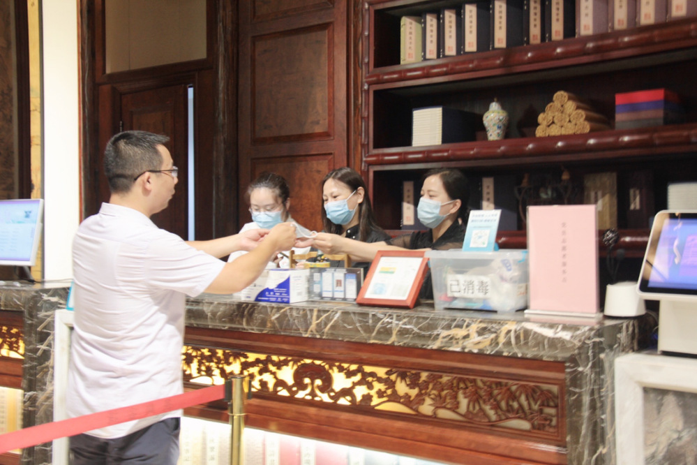 長樂客棧大堂作為旅客辦理入住和退房的公共區(qū)域,客流量較大,屬于疫情防控的第一道關(guān)口。為做好來店人員排查和信息登記工作,志愿者們充分發(fā)揮黨員帶頭作用,同前廳大堂工作人員一道對(duì)來店旅客進(jìn)行檢測(cè)體溫、查驗(yàn)蘇康碼和行程碼以及發(fā)放口罩,第一時(shí)間向旅客們宣傳疫情防控有關(guān)注意事項(xiàng)。