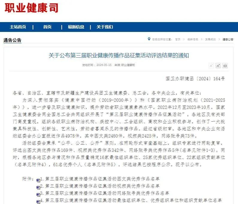為深入貫徹落實(shí)《健康中國(guó)行動(dòng)(2019-2030年)》和《國(guó)家職業(yè)病防治規(guī)劃(2021-2025年)》,進(jìn)一步普及職業(yè)健康知識(shí),提升勞動(dòng)者職業(yè)健康素養(yǎng)水平,國(guó)家衛(wèi)生健康委、全國(guó)總工會(huì)共同組織開(kāi)展了“第三屆職業(yè)健康傳播作品征集活動(dòng)”。我公司積極創(chuàng)作,踴躍參與征集活動(dòng),選送的《共享職業(yè)健康 共創(chuàng)健康水務(wù)》經(jīng)過(guò)初審、形式審查和專(zhuān)家評(píng)審等程序,入圍獲獎(jiǎng)名單。