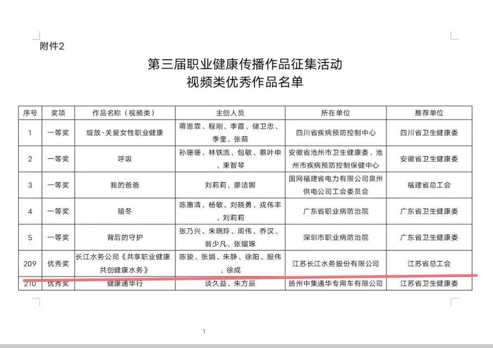 近日,國(guó)家衛(wèi)生健康委員會(huì)公布了“第三屆職業(yè)健康傳播作品征集活動(dòng)評(píng)選結(jié)果”,其中,江蘇長(zhǎng)江水務(wù)股份有限公司選送的《共享職業(yè)健康 共創(chuàng)健康水務(wù)》獲視頻類(lèi)作品優(yōu)秀獎(jiǎng),為我省總工會(huì)推送的六件獲獎(jiǎng)作品之一,是我市總工會(huì)推送的唯一一件獲獎(jiǎng)作品。榮譽(yù)的取得,不僅是對(duì)公司在職業(yè)健康傳播方面所做工作的肯定,更是對(duì)公司深入淺出、富有創(chuàng)意的健康科普宣傳的認(rèn)可。