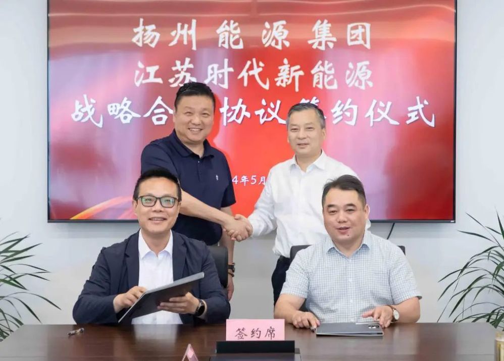 5月29日下午,揚(yáng)州能源集團(tuán)與江蘇時(shí)代新能源科技有限公司簽訂發(fā)展合作框架協(xié)議,城控集團(tuán)副總經(jīng)理、能源集團(tuán)董事長孔德存與寧德時(shí)代區(qū)域總經(jīng)理陳凌出席簽約儀式。