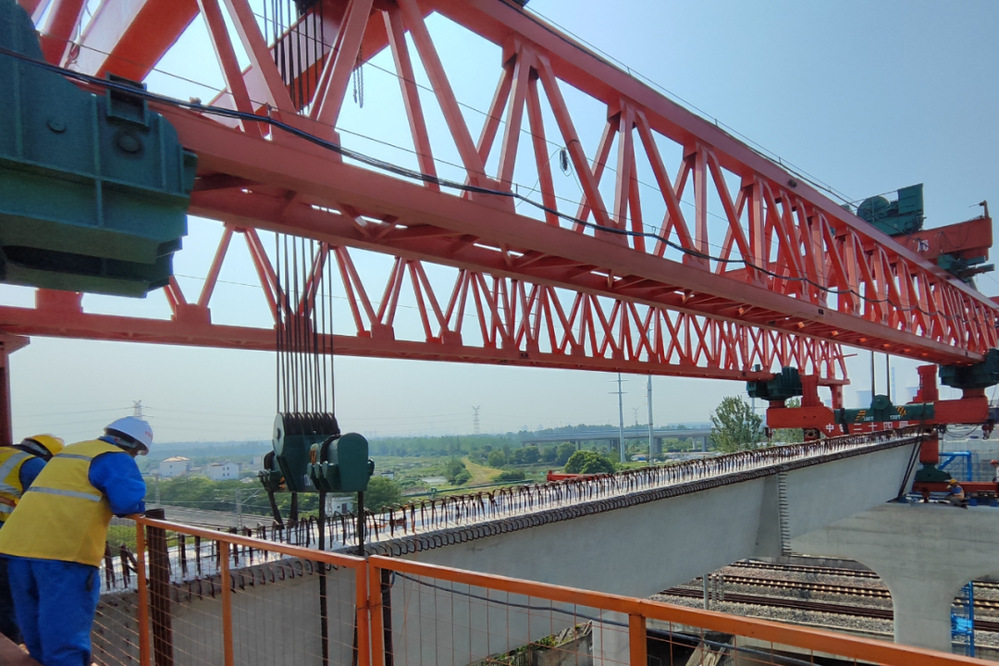 8月10日上午,運(yùn)河路北延鐵路鄰跨順利完成架橋機(jī)過軌、首片箱梁架設(shè)施工任務(wù),打響了跨鐵路箱梁架設(shè)施工第一槍。