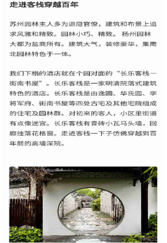 長樂客棧位于中國十大歷史文化名街之一的東關(guān)歷史文化街區(qū),占地3.5萬平方米,建筑面積2萬平方米,現(xiàn)有員工140余人,客房130余間(套),是揚(yáng)州市首家民居式精品文化酒店。通過對酒店區(qū)域內(nèi)逸圃(民國初年錢業(yè)經(jīng)紀(jì)人李鶴生老宅)、街南書屋(馬氏鹽商的住宅)、李長樂故居(清代名將李長樂將軍府)、華氏園(清末民初鹽商華友梅老宅)等名人故居、古建老宅等空間載體的保護(hù)修復(fù),在充分體現(xiàn)了揚(yáng)州園林因地制宜、參差自然、巧于因借、步移景異等藝術(shù)特點(diǎn)的同時(shí),讓古城歷史文化遺跡煥發(fā)出新的生機(jī)和活力,成為我市推進(jìn)古城整體保護(hù)、有機(jī)更新和活化利用的優(yōu)秀案例。