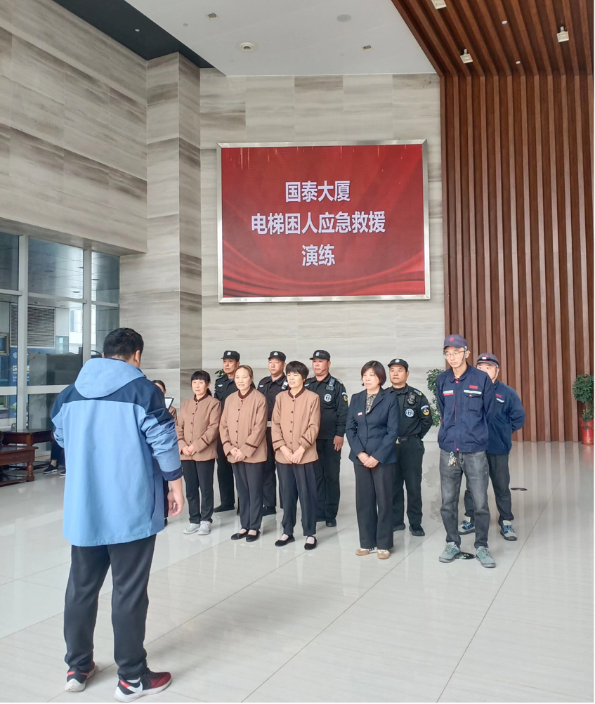 為進(jìn)一步增強(qiáng)業(yè)主乘坐電梯的安全防范意識(shí),提高突發(fā)事件的應(yīng)變能力,同時(shí)為提高物業(yè)工作人員處置突發(fā)事件的應(yīng)急能力,掌握突發(fā)事件的崗位職責(zé)和處理流程。10月11日上午,國(guó)泰大廈物業(yè)服務(wù)中心聯(lián)合電梯維保單位在國(guó)泰大廈2號(hào)樓開展電梯困人應(yīng)急救援實(shí)戰(zhàn)演練。
