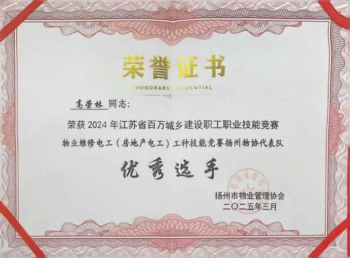 維修電工(房地產(chǎn)電工)工種技能競賽“優(yōu)秀選手 ”,高榮林同志,憑借出色的工作技能,在省級競賽“江蘇省百萬城鄉(xiāng)建設職工職業(yè)技能競賽物業(yè)維修電工(房地產(chǎn)電工)工種技能競賽”中榮獲“優(yōu)秀選手 ”稱號。這一榮譽稱號,不僅是對該名員工個人能力的認可,更是對城建物業(yè)在員工培養(yǎng)與團隊建設方面的肯定。