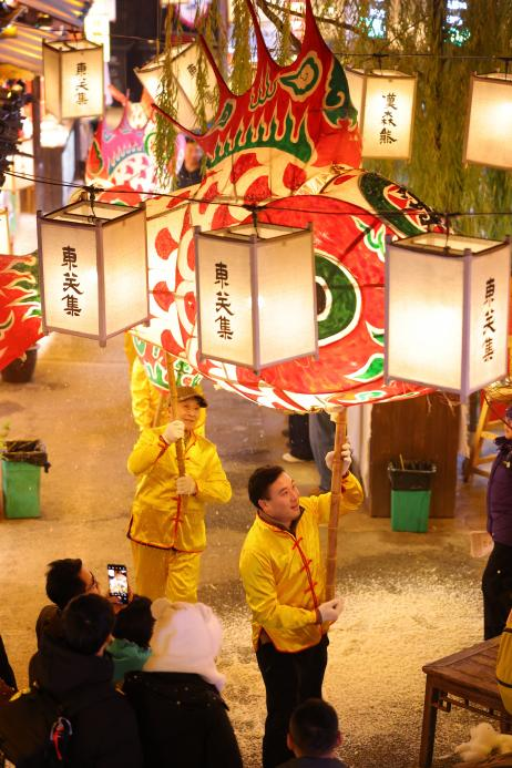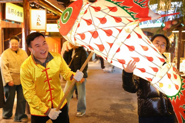 活動現(xiàn)場,三十余盞手工制作的巨型魚燈璀璨生輝。巡游隊伍身著傳統(tǒng)服飾,手持“年年有魚,國泰民安”主題的彩色魚燈,在鑼鼓聲中沿古街徐徐前行,吸引眾多游客駐足觀賞。“這魚燈巡游的‘嬉魚’老傳統(tǒng),聽我祖輩說已有六百多年歷史。今年能從臘月一直熱鬧到過年,真是太好了!”原住民王老太望著巡游隊伍,欣慰地說道。