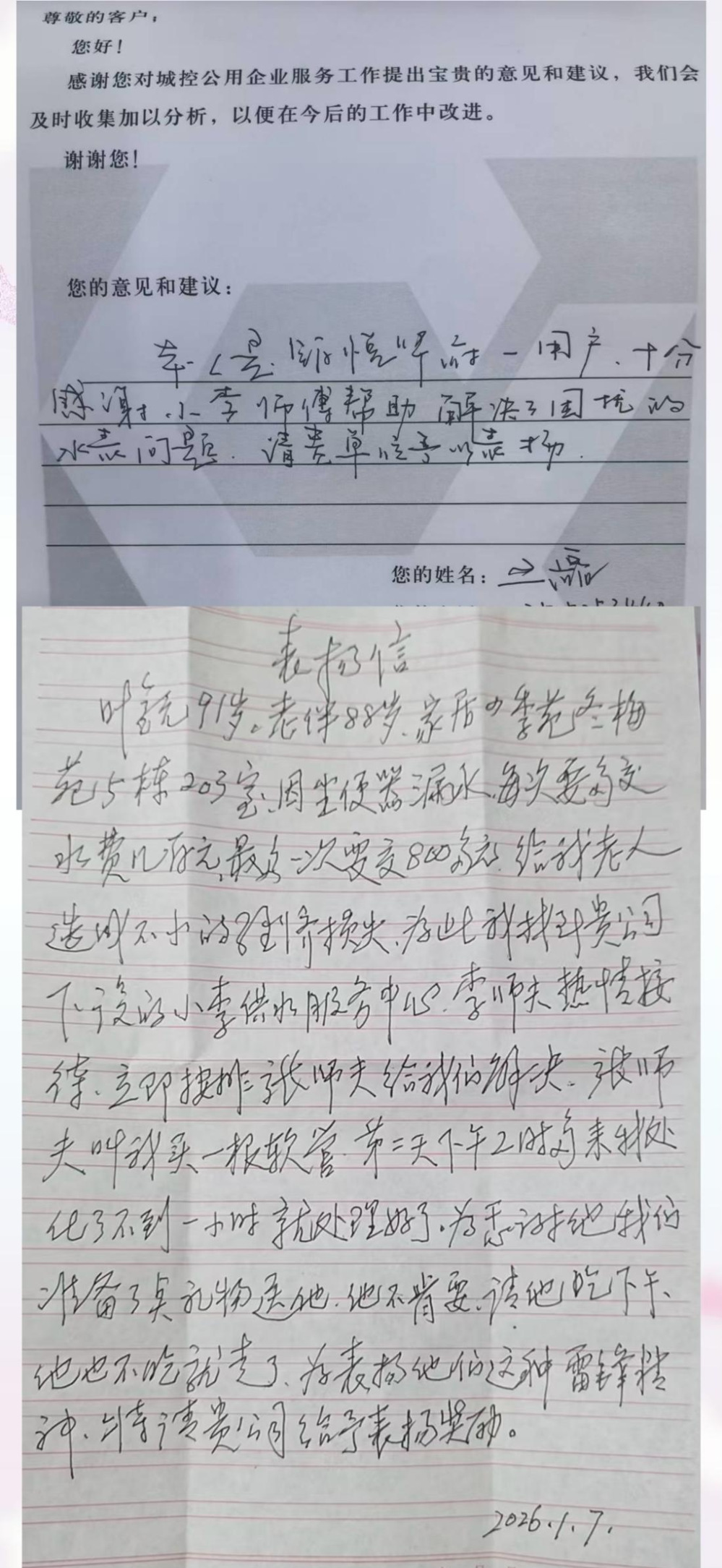 2025年12月10日下午及2026年1月7日,長(zhǎng)江水務(wù)小李服務(wù)隊(duì)隊(duì)長(zhǎng)李青同志及隊(duì)員,在文匯東路服務(wù)大廳先后收到兩位用戶的高度贊揚(yáng)。用戶對(duì)服務(wù)隊(duì)專(zhuān)業(yè)高效、熱情周到的服務(wù)給予了誠(chéng)摯肯定。