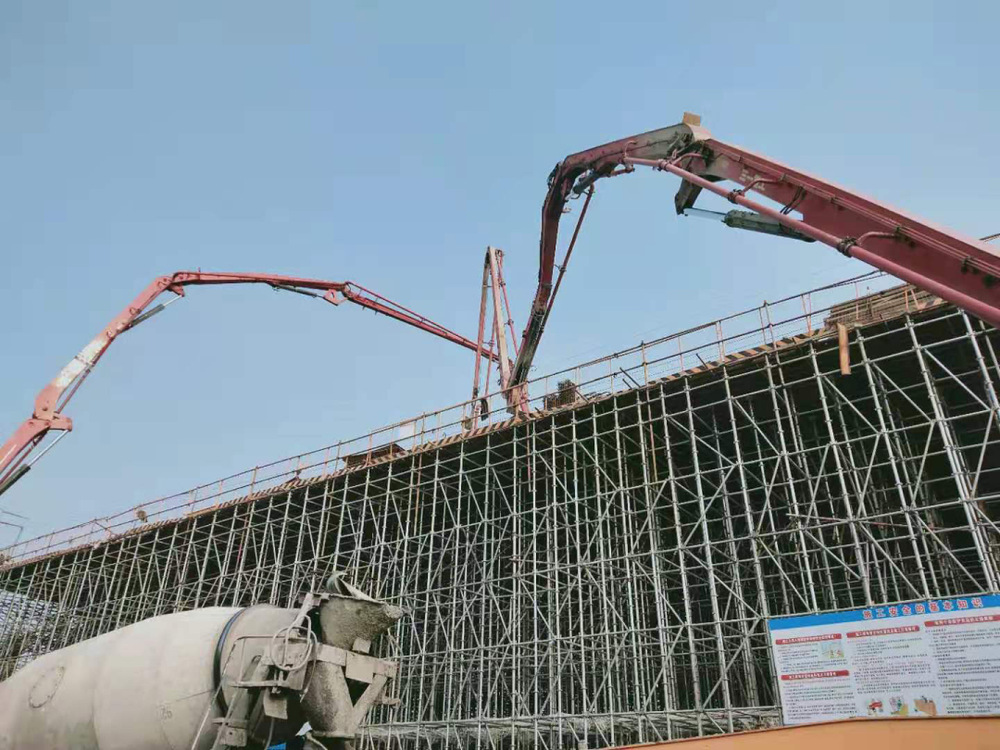 此次澆筑的箱梁底腹板為潤揚(yáng)路快速化改造工程中長度最長、工程量最大的段面,共三跨、125米,共計(jì)澆筑1800m3。第六聯(lián)現(xiàn)澆箱梁上跨楊柳青路,跨徑為35米、55米、35米,采用門洞支架施工,確保楊柳青路正常通行。門洞采用兩跨的形式,凈高5米,單跨寬7.5米,能夠保證車輛正常通行。項(xiàng)目主線高架橋橋梁全長1129.63米,共13聯(lián),其中12聯(lián)為預(yù)應(yīng)力混凝土連續(xù)箱梁,1聯(lián)為鋼箱梁。