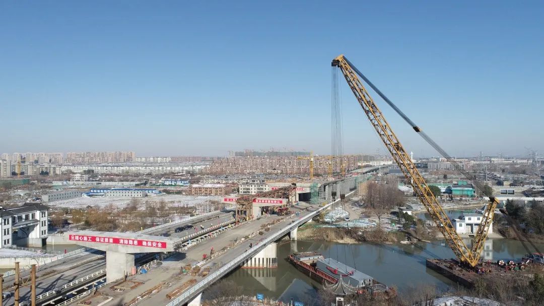 跨古運河鋼箱梁橋施工是項目的重難點。為了確保此次吊裝順利完成,項目部成功解決了35KV高壓遷改、老橋下部結(jié)構(gòu)施工空間受限、橋位西側(cè)揚州閘導(dǎo)流墩對吊裝設(shè)備站影響、老橋上不能搭設(shè)臨時支架、鋼梁兩側(cè)混凝土箱梁同時施工等多重困難,對現(xiàn)場施工人員進(jìn)行安全技術(shù)交底,及時清除承臺冰雪,做好冬季防護(hù)措施。