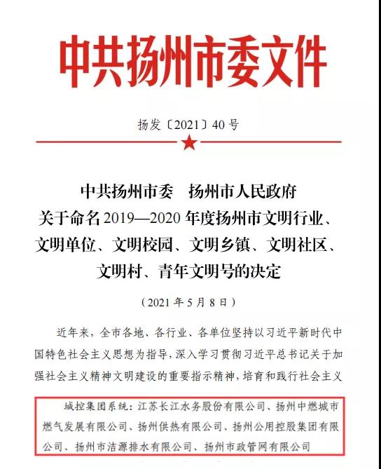 近日,市委、市政府發(fā)布《關于命名2019—2020年度揚州市文明行業(yè)、文明單位、文明校園、文明鄉(xiāng)鎮(zhèn)、文明社區(qū)、文明村、青年文明號的決定》,城控集團所屬江蘇長江水務股份有限公司、揚州中燃城市燃氣發(fā)展有限公司、揚州供熱有限公司、揚州公用控股集團有限公司、揚州市潔源排水有限公司、揚州市政管網(wǎng)有限公司等6家單位榮獲“市級文明單位”稱號。