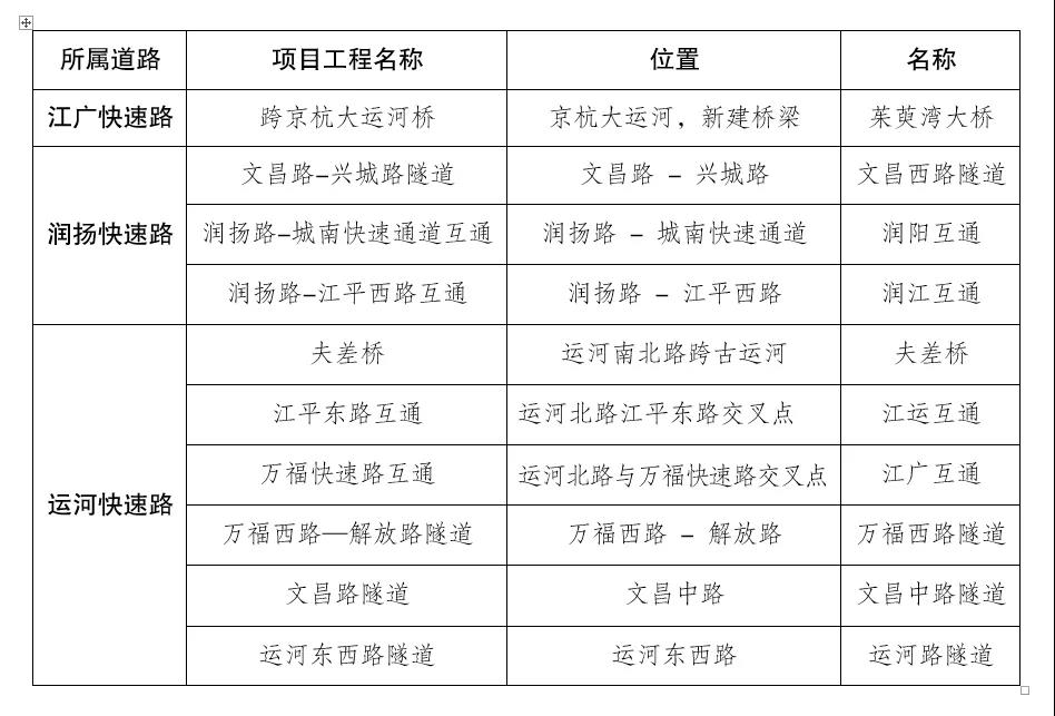 運(yùn)河快速路:位于邗江區(qū)及廣陵區(qū),運(yùn)河北路、運(yùn)河南路原址改造,北起江平東路,南至七里河路。全長約7.85公里,包括4.75公里高架、2.5公里隧道、0.6公里地面段和2座互通。