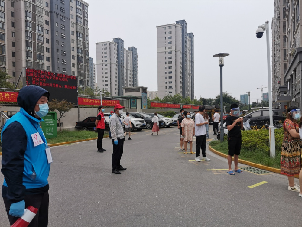 “請(qǐng)大家排好隊(duì),保持一米以上安全距離,不要造成人員聚集,請(qǐng)?zhí)崆皽?zhǔn)備好你的身份證……”志愿者不斷提醒居民注意。在翠月花園核酸采集點(diǎn),志愿者們穿梭在排隊(duì)人群中,邊安撫居民緊張情緒,邊引導(dǎo)居民即測(cè)即走?!半m然天氣很悶熱,工作量很大,但是我們有信心能保質(zhì)保量完成全小區(qū)核酸檢測(cè)任務(wù)?!彼麄儾活櫤韲邓粏?,依舊熱情且耐心地回答居民的問(wèn)題,引導(dǎo)現(xiàn)場(chǎng)秩序。11日下午,雨淅淅瀝瀝下個(gè)不停。雖然避雨棚近在咫尺,但志愿者們面對(duì)風(fēng)雨寸步不離崗位,他們笑著說(shuō)道“這點(diǎn)風(fēng)雨算啥呀?”一周來(lái),志愿者們協(xié)助社區(qū)開(kāi)展了4次核酸檢測(cè),共檢測(cè)居民約12000人次。