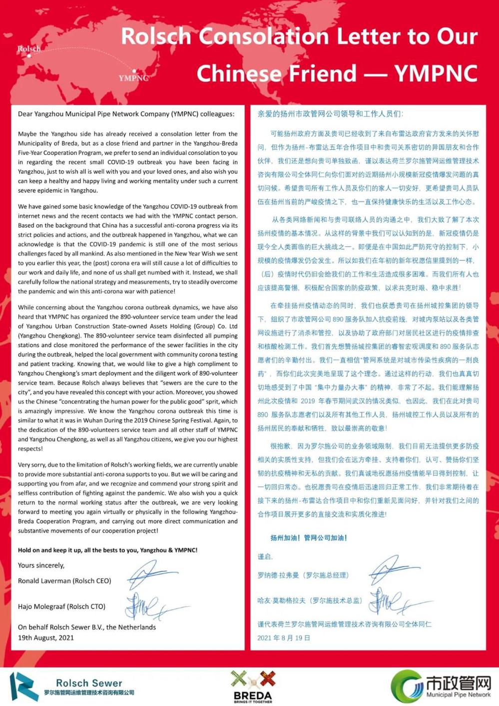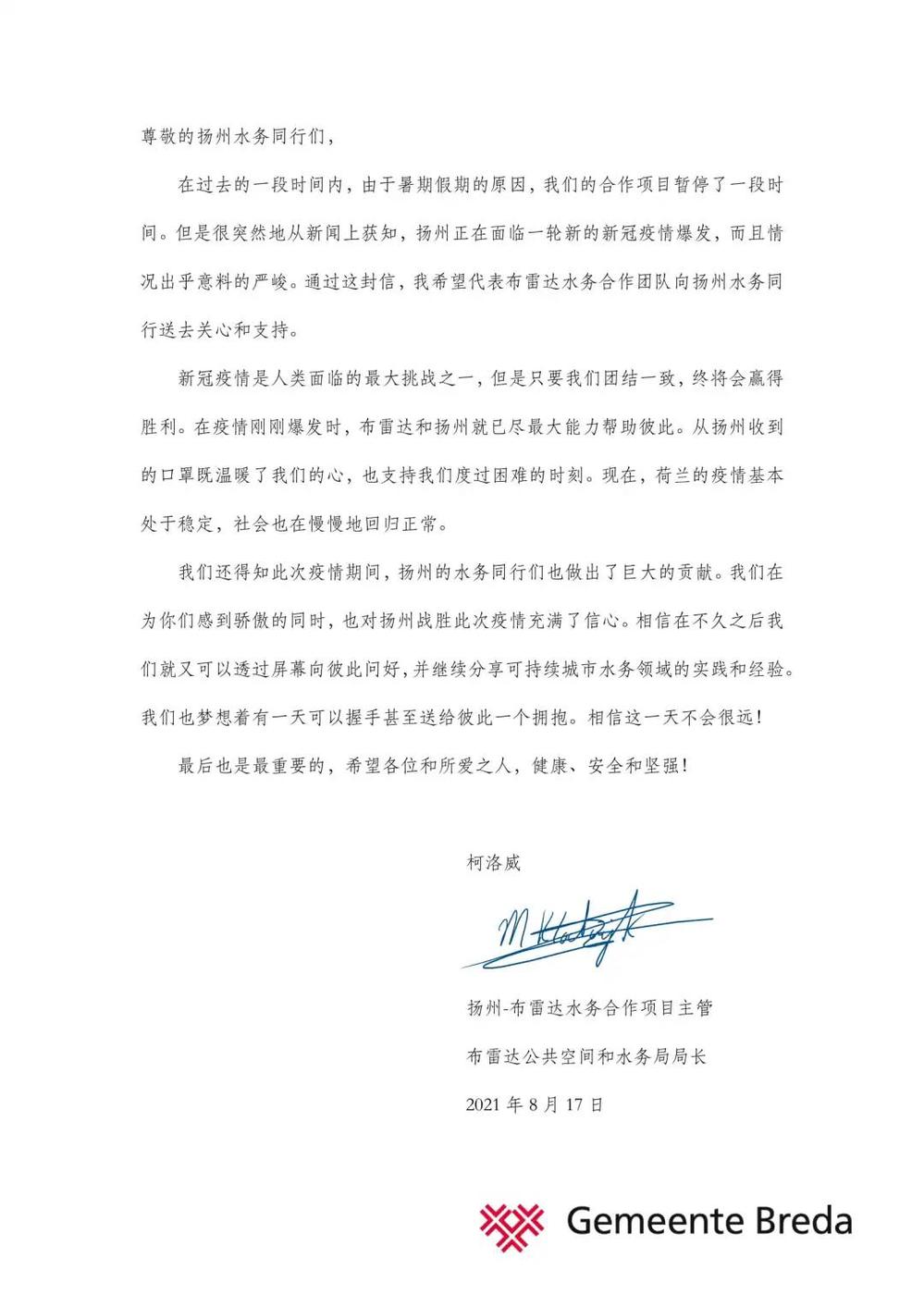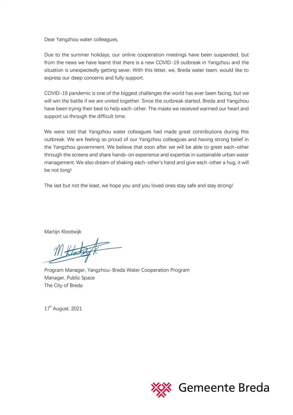 8月18日,在我市新冠肺炎疫情防控的攻堅(jiān)時(shí)刻,城控集團(tuán)收到荷蘭布雷達(dá)市公共空間和水務(wù)局以及羅爾施管網(wǎng)運(yùn)維管理技術(shù)咨詢(xún)有限公司發(fā)來(lái)的暖心慰問(wèn)函。信函中,布雷達(dá)市公共空間和水務(wù)局局長(zhǎng)馬丁·科洛威先生以及羅爾施管網(wǎng)運(yùn)維管理技術(shù)咨詢(xún)有限公司總經(jīng)理羅納德·拉弗曼先生對(duì)我市正在蔓延的新冠肺炎疫情表示關(guān)切;向身處疫情中的廣大城控集團(tuán)員工及家人表示誠(chéng)摯的問(wèn)候,對(duì)“890管網(wǎng)服務(wù)隊(duì)”代表的“城控”抗疫志愿者奮戰(zhàn)“疫”線的擔(dān)當(dāng)精神,致以崇高的敬意。這封遠(yuǎn)隔重洋飛馳而來(lái)的慰問(wèn)信,彰顯了兩座城市間彌足珍貴的友誼,也增強(qiáng)了“城控人”打贏這場(chǎng)疫情防控阻擊戰(zhàn)的信心。