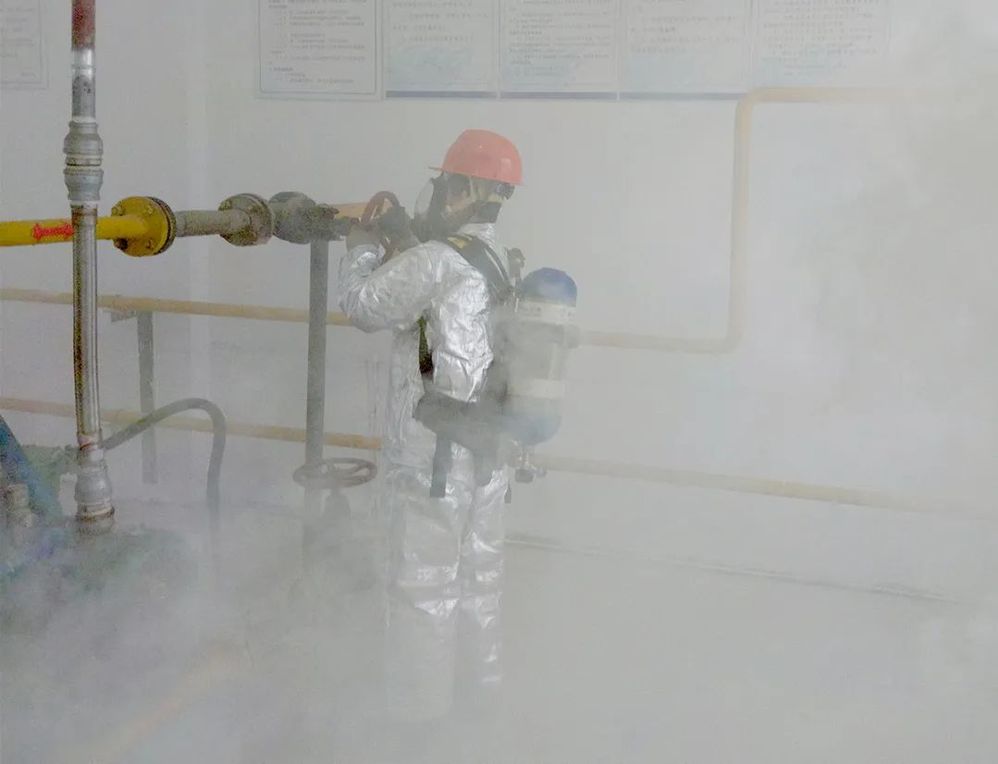 第二階段演練模擬壓縮機(jī)房發(fā)生泄漏。演練人員先切斷所有電源,關(guān)閉閥門,疏散無關(guān)人員。上報公司后,組織人員迅速穿戴防護(hù)服與正壓式呼吸器進(jìn)入現(xiàn)場,在判定為法蘭連接處為泄漏點后,使用不發(fā)火工具,對泄漏部位進(jìn)行搶修,再使用可燃?xì)怏w檢漏儀對泄漏點進(jìn)行檢查,確保無泄漏。