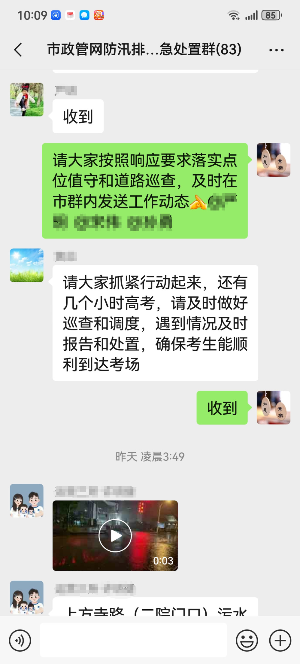 6月6日開始,各相關部門已根據(jù)天氣預警按照統(tǒng)一部署和既定安排開展污水設施加密巡查,部署好應急人員、物資隨時待命。6月7日凌晨3時23分氣象部門發(fā)布暴雨藍色預警后,公司立即通過“城排通”系統(tǒng)啟動應急預案,快速落實污水設施、雨水排口、易積水點和在建工程現(xiàn)場的巡查和應急處置工作。由于突降暴雨,市區(qū)部分道路很快出現(xiàn)積水,且涉及多個高考考點周邊,情況十分緊急,與此同時氣象部門緊急升級發(fā)布暴雨黃色預警。為及時做好處置,公司第一時間調(diào)整了應急響應等級,通過“城排通”系統(tǒng)實時監(jiān)測運行數(shù)據(jù),加強信息共享和部門間應急聯(lián)動,適時調(diào)整運行調(diào)控策略,對發(fā)現(xiàn)的路面積水險情,迅速指揮、調(diào)度搶險班組和物資開展應急排澇。