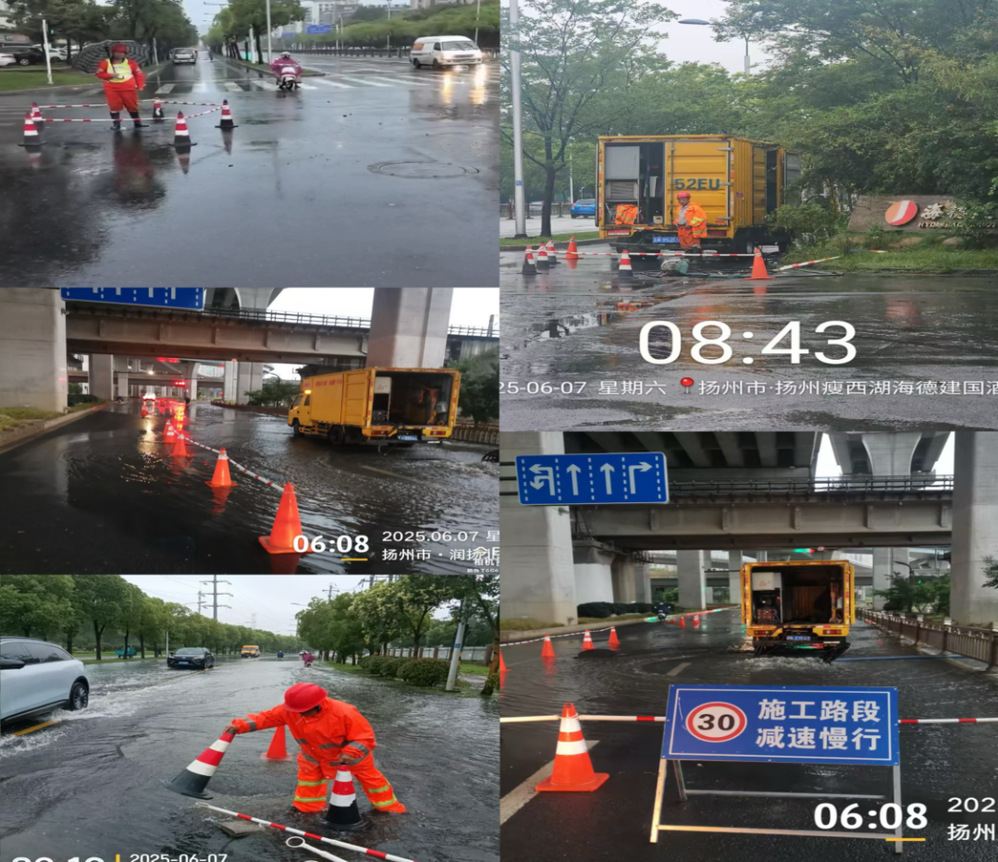 在排澇現(xiàn)場,工作人員在規(guī)范做好積水路段安全提示、圍擋及行人、車輛導流的基礎上,用撬棍、鋼筋勾打開積水點周邊雨污水井蓋助排雨水,用排水設備抽排路面積水,最短時間內(nèi)消除了路段積水,及時恢復路面正常通行。截止6月7日早晨7時左右,公司管轄范圍內(nèi)的積水路段基本消除。同時,工作人員在涉及送考路線加強來回巡查,為防止發(fā)生意外,重點路段還安排了專人值守。
