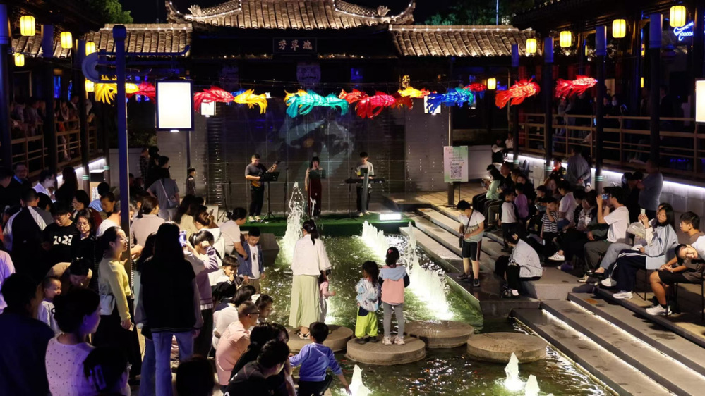 市集之上,音樂聲與歡笑聲交織回蕩。樂隊(duì)的精彩演繹中,動(dòng)感旋律瞬間點(diǎn)燃觀眾熱情,不少市民、游客主動(dòng)登臺(tái)獻(xiàn)唱,沉浸式享受熱鬧氛圍;古運(yùn)河邊軒窗輕啟,舞者于窗前水袖翻飛,不時(shí)與河邊游客互動(dòng),為喧鬧市集注入了鮮活靈動(dòng)的氣息。