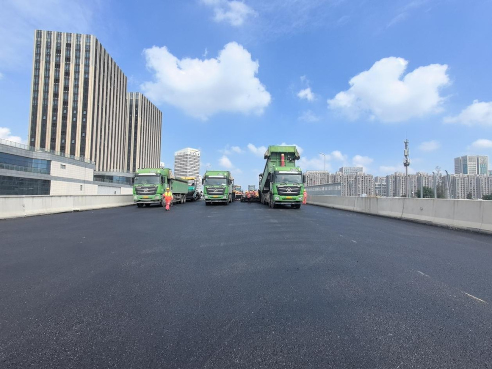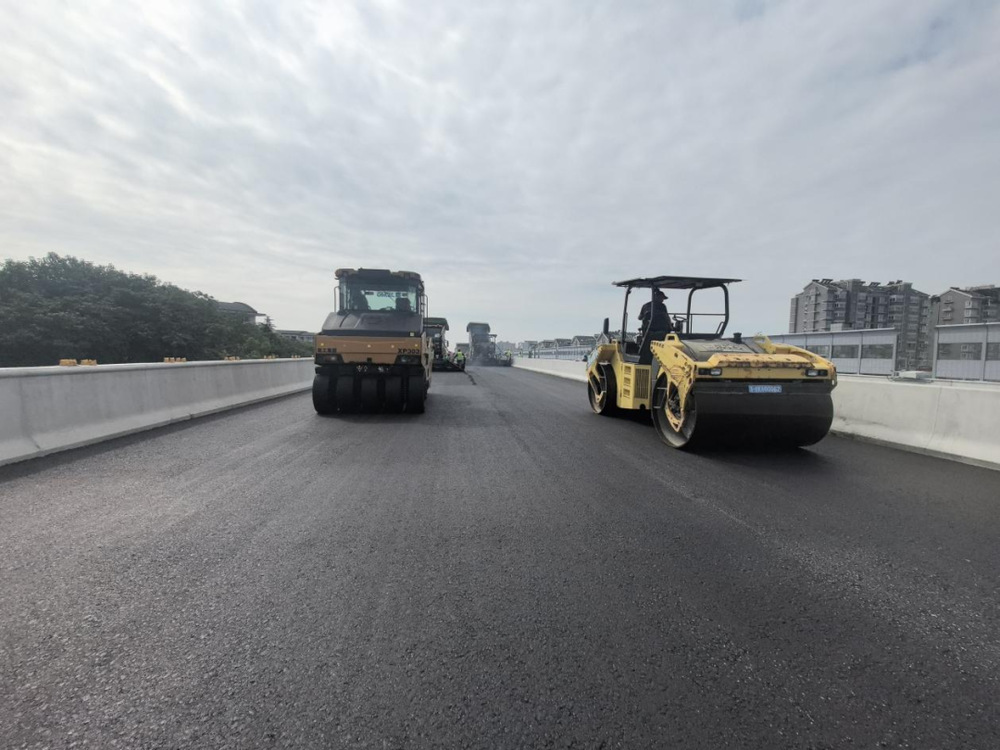 施工過程中,現(xiàn)場攤鋪機(jī)、壓路機(jī)等設(shè)備有序作業(yè),管理人員對原材料質(zhì)量、攤鋪溫度、厚度及平整度進(jìn)行嚴(yán)格控制,確保各項施工符合各項規(guī)范要求,為后續(xù)橋面交通標(biāo)志標(biāo)線施劃、智能交通監(jiān)控設(shè)施及亮化設(shè)備安裝打下基礎(chǔ)。