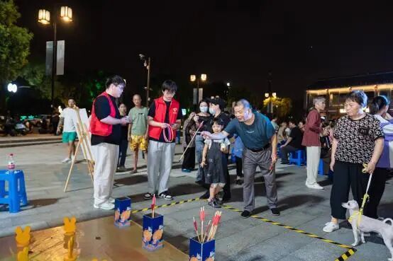 除了文化雅韻,現(xiàn)場設(shè)置了多個互動打卡與市集體驗區(qū),讓節(jié)日氛圍更添煙火氣?!拔以谛炷拊铝痢贝蚩c(diǎn)前,居民手持造型精巧的月亮小夜燈定格溫馨瞬間;“玉兔投壺”游戲區(qū)排起長隊,老少同樂間復(fù)刻古代士人的閑情雅趣。“月光市集”匯集文創(chuàng)手作、中秋美食等,市民憑游園卡完成互動、集齊印章,即可兌換月亮小夜燈和冰皮月餅,將節(jié)日祝?;饔|手可及的溫暖。