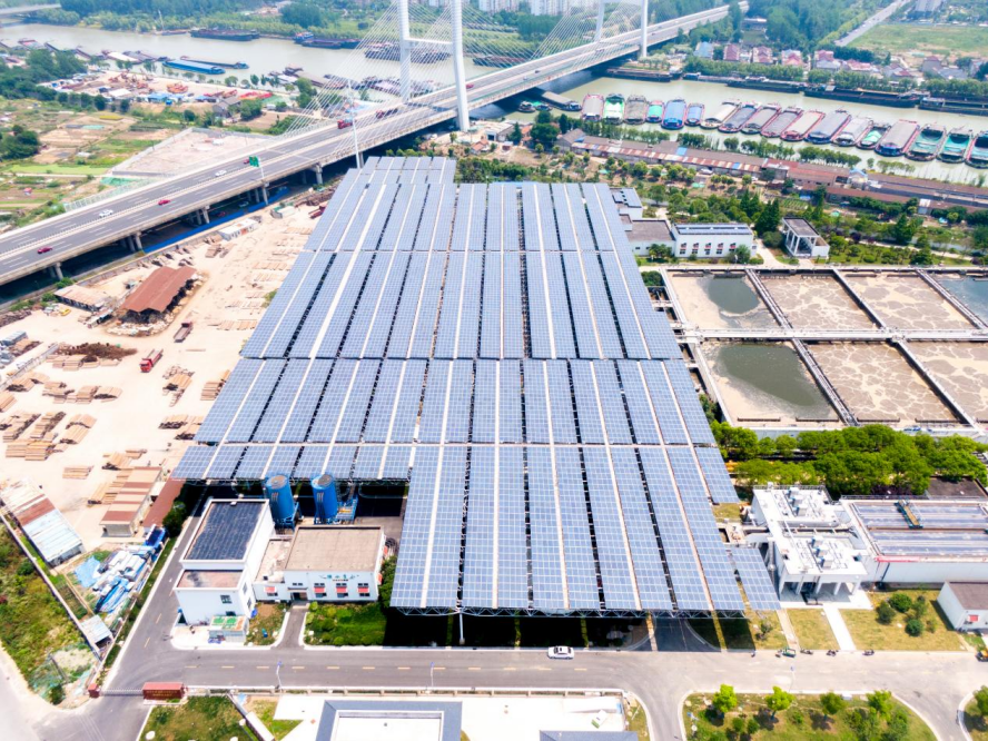 圖注:全國(guó)首批、江蘇首家建成投產(chǎn)的“光伏+水務(wù)”項(xiàng)目(湯汪污水處理廠(chǎng)電站)