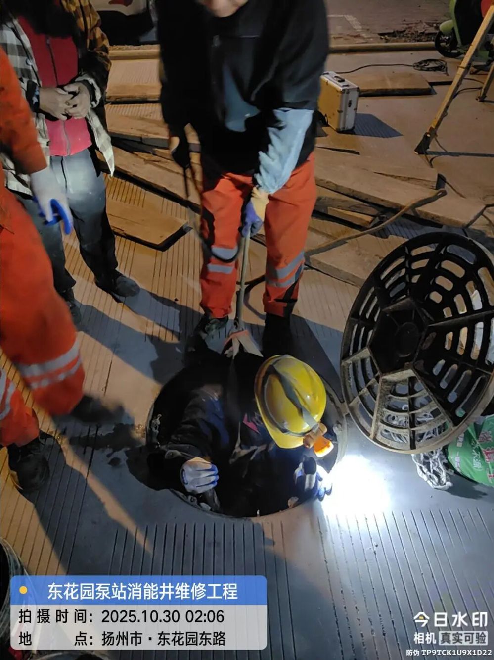 施工期間,工人們默契配合。地下有限空間內,老師傅劉工一邊仔細地進行密封加固,一邊向年輕工友傳授經驗:“這種防水處理要像繡花一樣精細,一道工序不到位,就可能前功盡棄。”而在井外,降噪措施也同步實施,工人們輕拿輕放工具,低聲交流,生怕打破夜的寧靜。原本計劃的夜間施工任務,僅用一個半小時便高效完成,較預期大幅縮短工期。