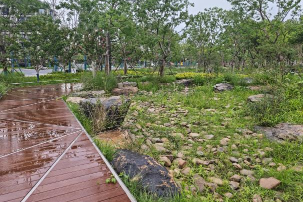 通過融合景觀設計、排水工程、海綿城市等多項專業(yè)技術,共打造雨水花園1792m2,實現(xiàn)可調蓄容積412m3,年徑流總量控制率達91.19%,年總控制雨水量11.64萬m3,面源污染削減率達63.83%,內澇防治標準達到三十年一遇重現(xiàn)期,為揚州成功入選2025年度中國海綿城市典范注入強勁動能。
